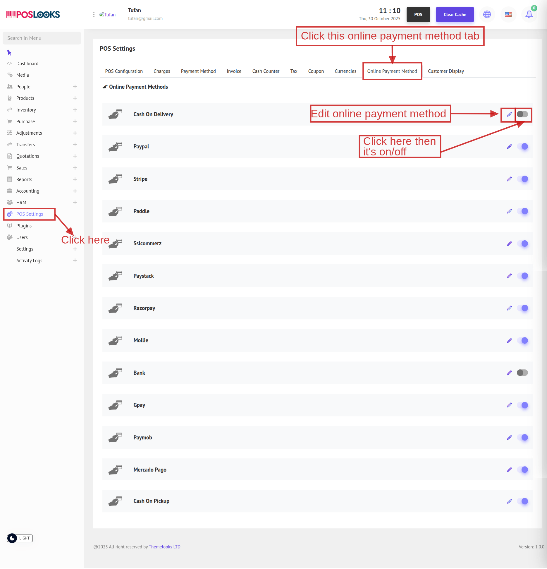 Go to POS Settings, then open the Online Payment Method tab to view the Online Payment Method page.