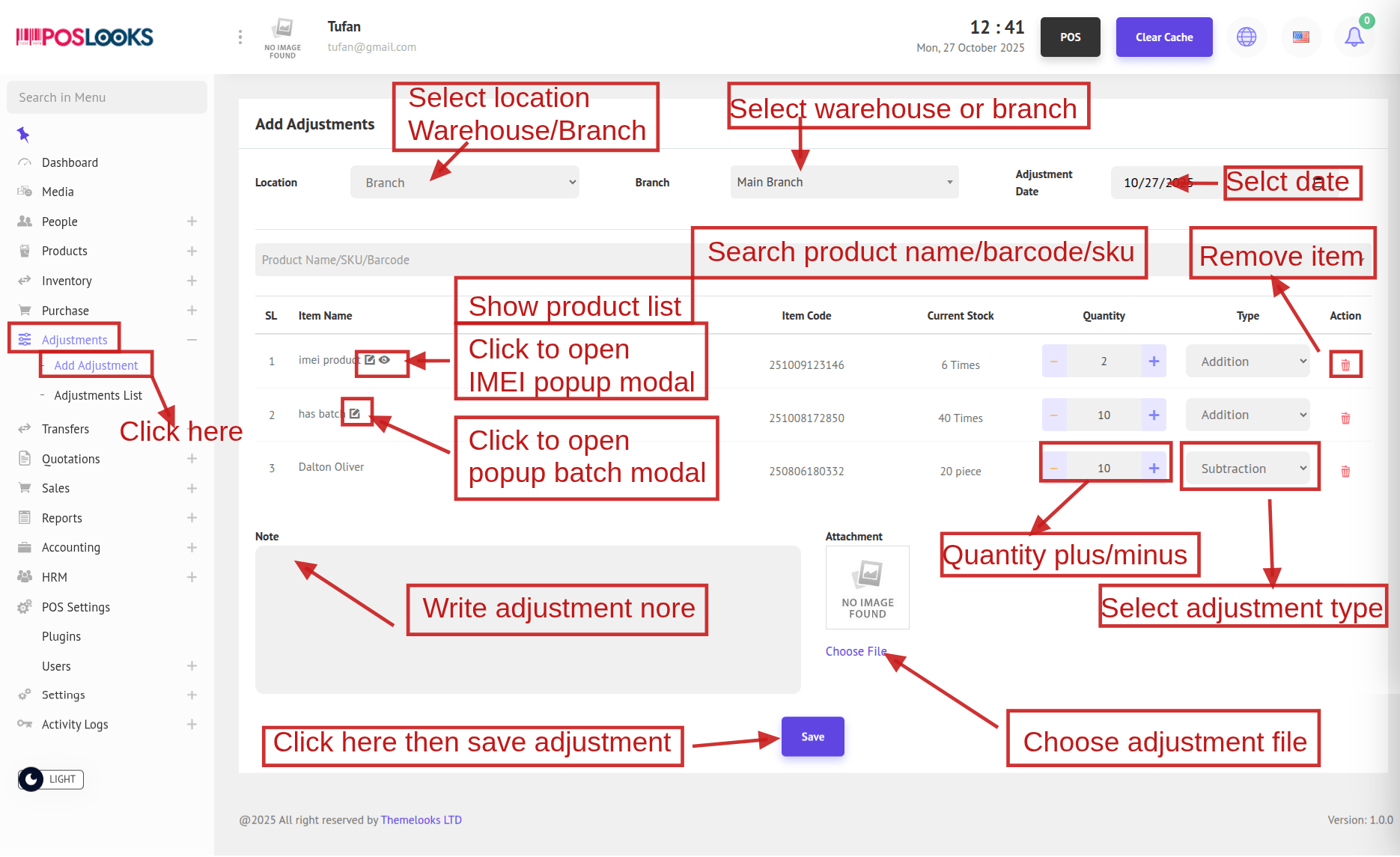 1. To add a new adjustment, navigate to Adjustment -> Add Adjustment from the menu bar. This will redirect you to the Add Adjustment page where you can create a new adjustment record.