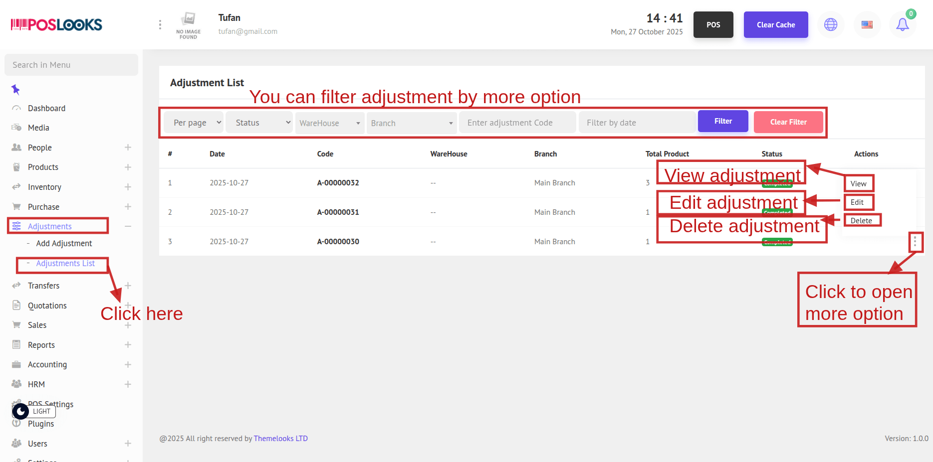 2. To see the Adjustment List, go to Adjustment -> Adjustment List from the menu bar. You will be able to view all adjustments on the Adjustment List page.