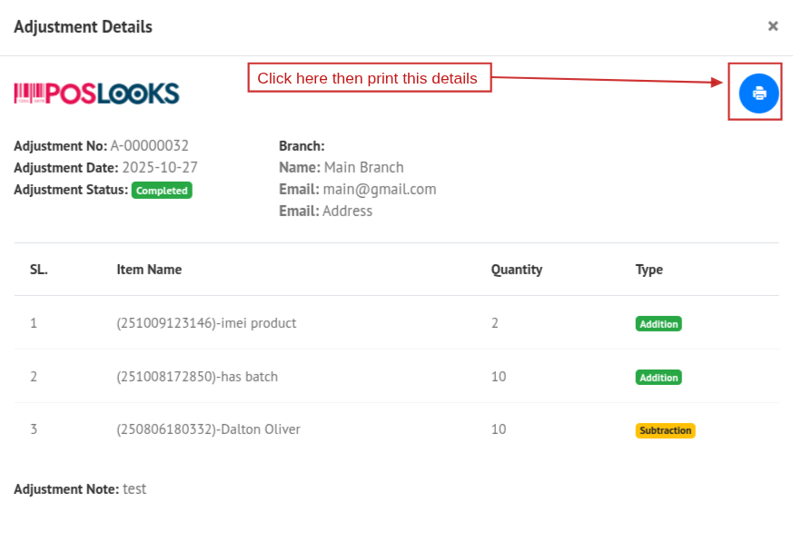 You can also view the details of an adjustment by clicking the View button. A popup modal will appear showing the adjustment details. You can print this page by clicking the Print icon, which will open the print view.