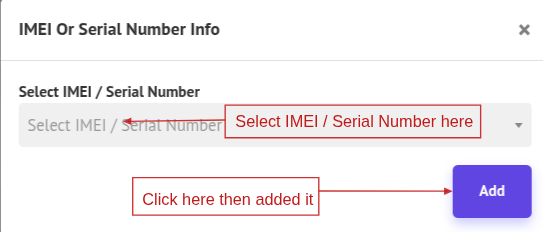 If the product has an IMEI, an IMEI modal will open. Select the IMEI and click Add. To edit it, click the Edit icon — the IMEI modal will open again. Change the IMEI and click Add to save the update.