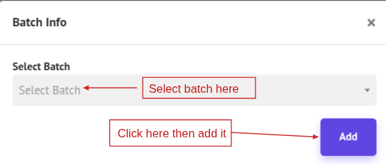 If the product has a Batch, a popup modal will open. Select the batch and click Add. To edit it, click the Edit icon — the batch modal will open again. Change the selection and click Add to update it.