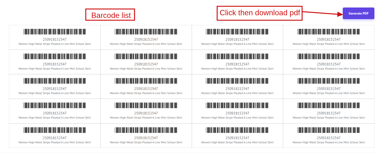 You can also download the generated bar-codes by clicking the Generate PDF button. This will create and download a PDF file.
