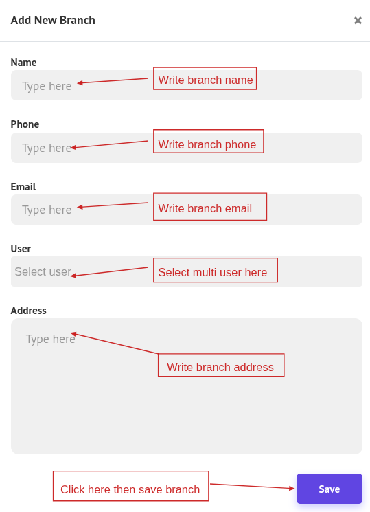 To add a new branch, click Add New Branch at the top-right of the page. A popup modal will appear where you can enter the branch details. Once completed, click Save to add the branch.