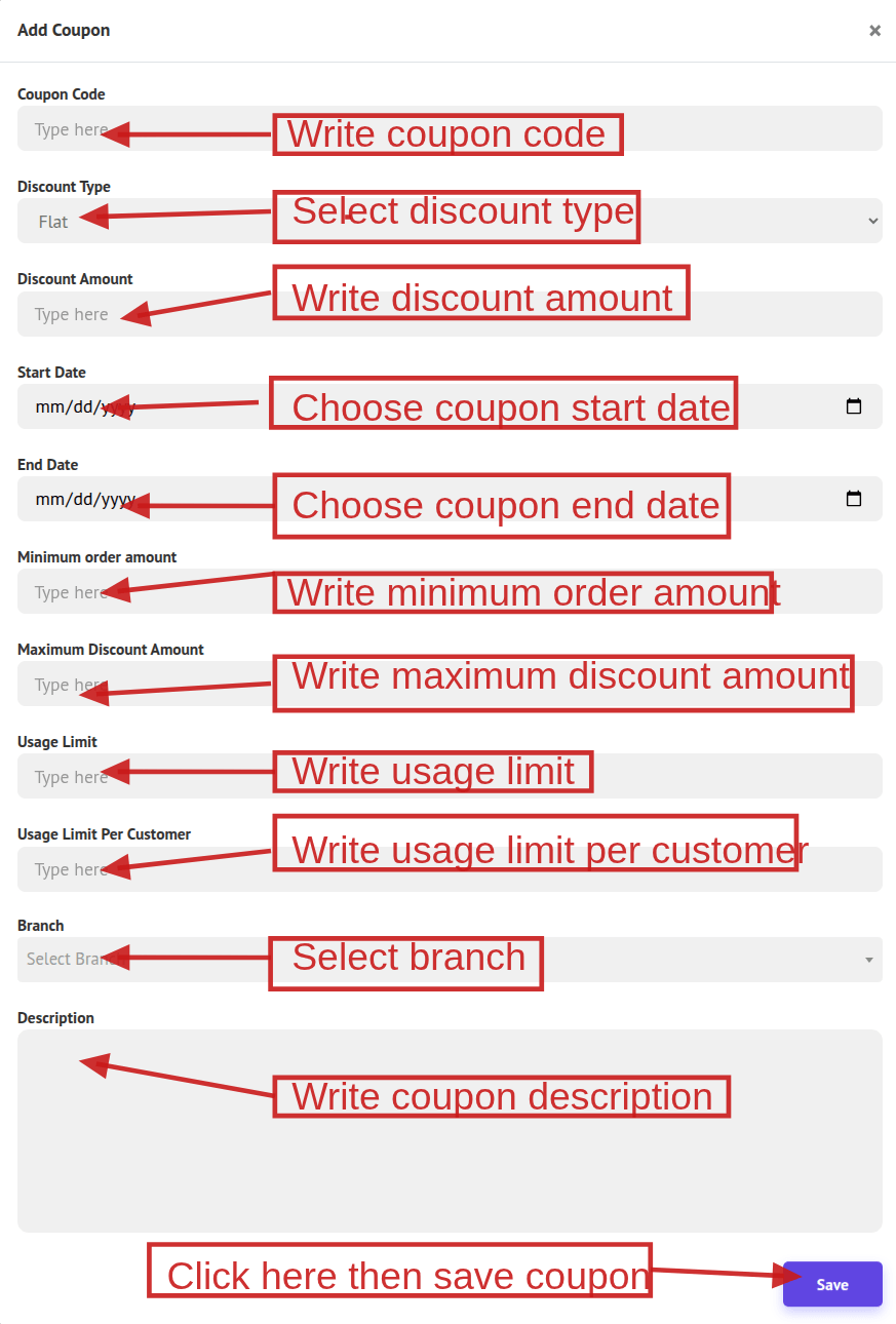 To create a new coupon, click Add Coupon. A popup window will open—complete all fields and click Save to create the coupon.