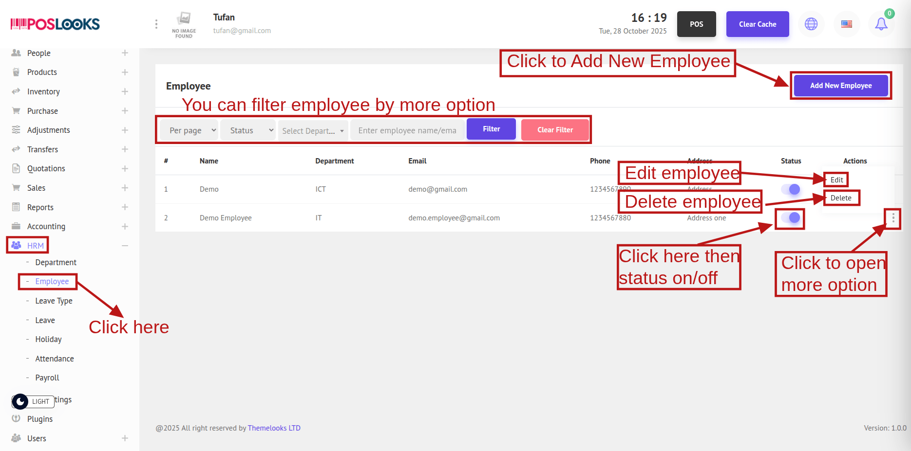 To see the Employee, go to HRM -> Employee from the menu bar. You will be able to view all employee on the Employee page.