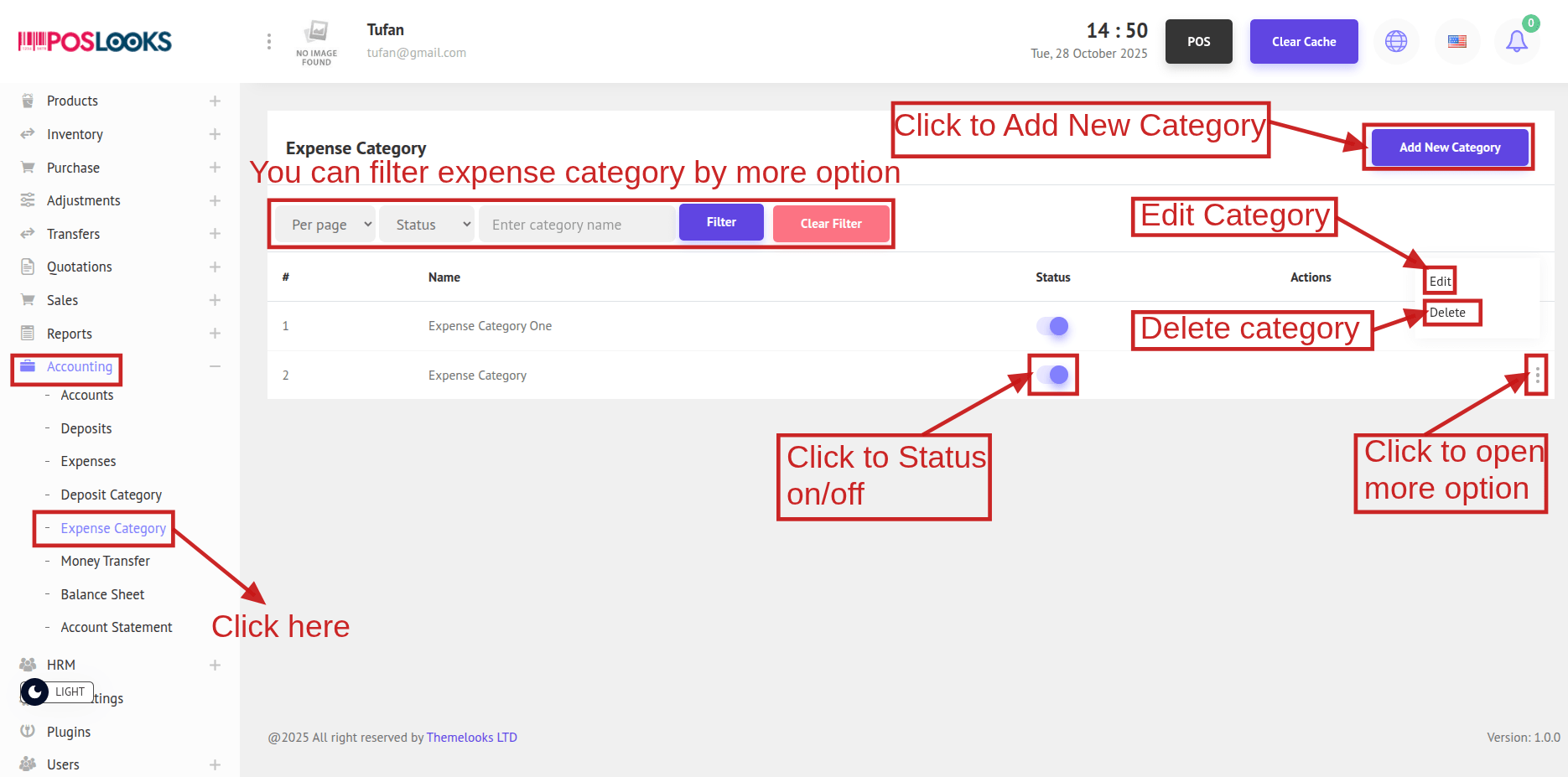To see the Expense Category list, go to Accounting -> Expense Category from the menu bar. You’ll be redirected to the Expense Category page, where all categories are displayed.