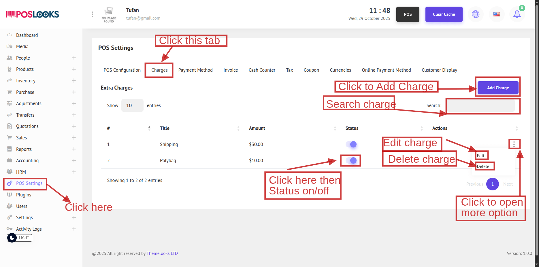 Go to POS Settings, then open the Charges tab to view the list of charges.