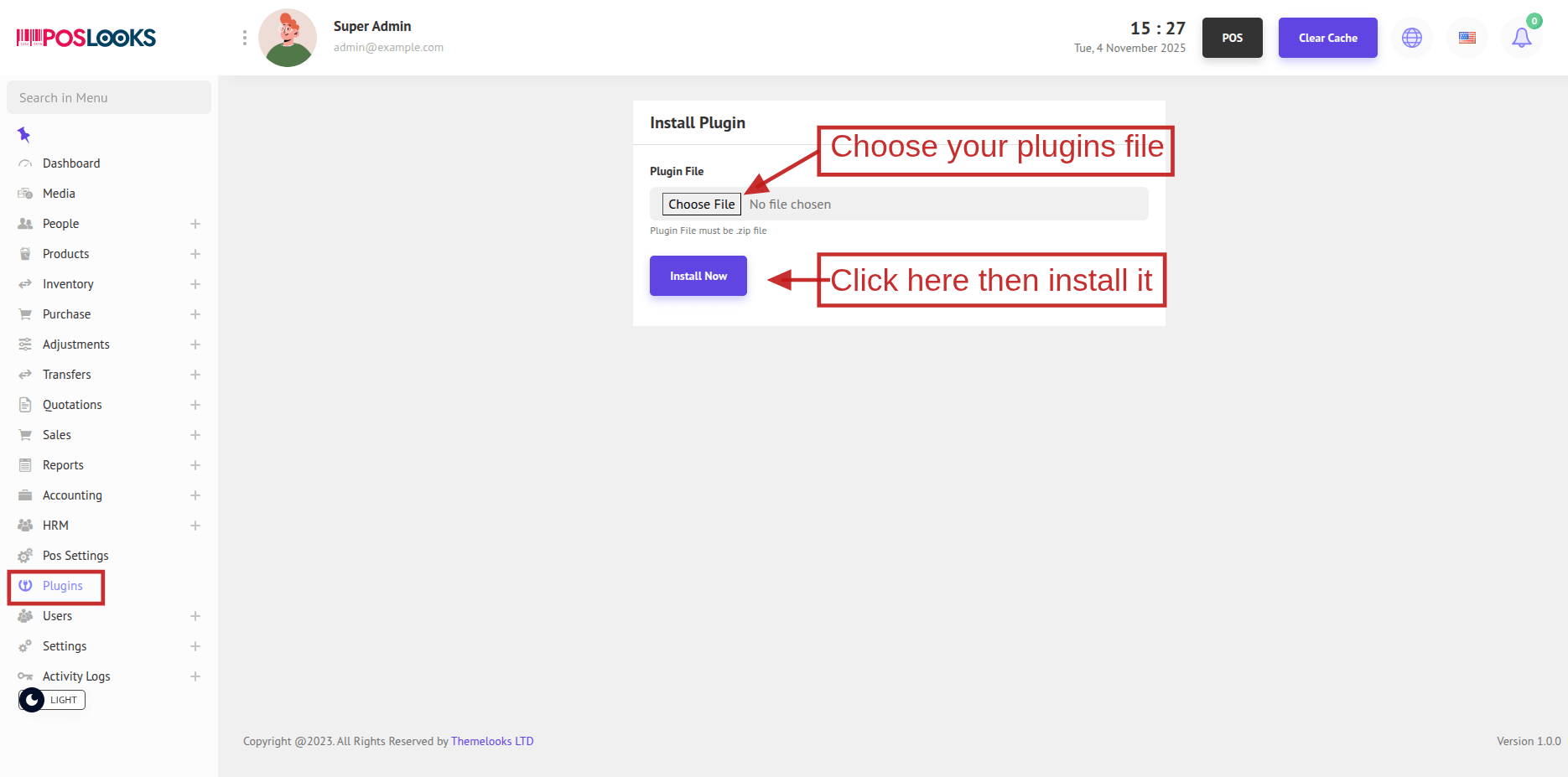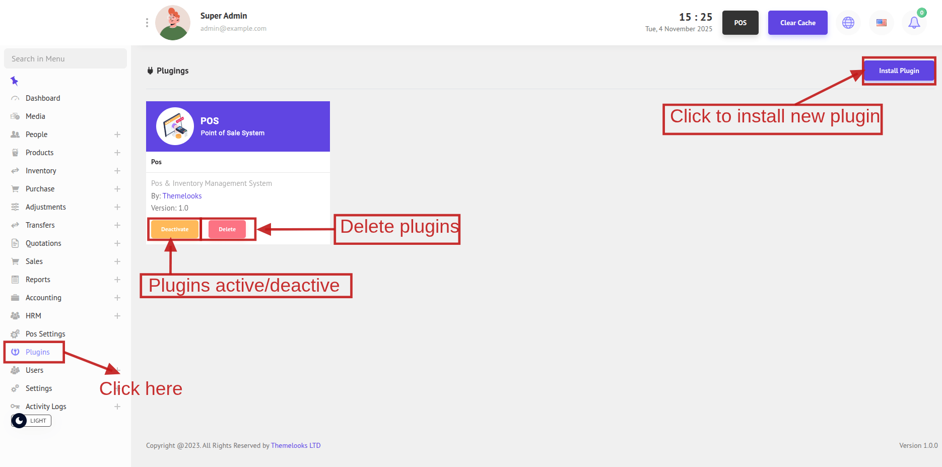 POSLooks has multiple plugin to run the system properly. You can easily manage these plugin from plugin module. In this post, you will learn how to activate, and deactivate Plugins. Follow Plugins from sidebar.