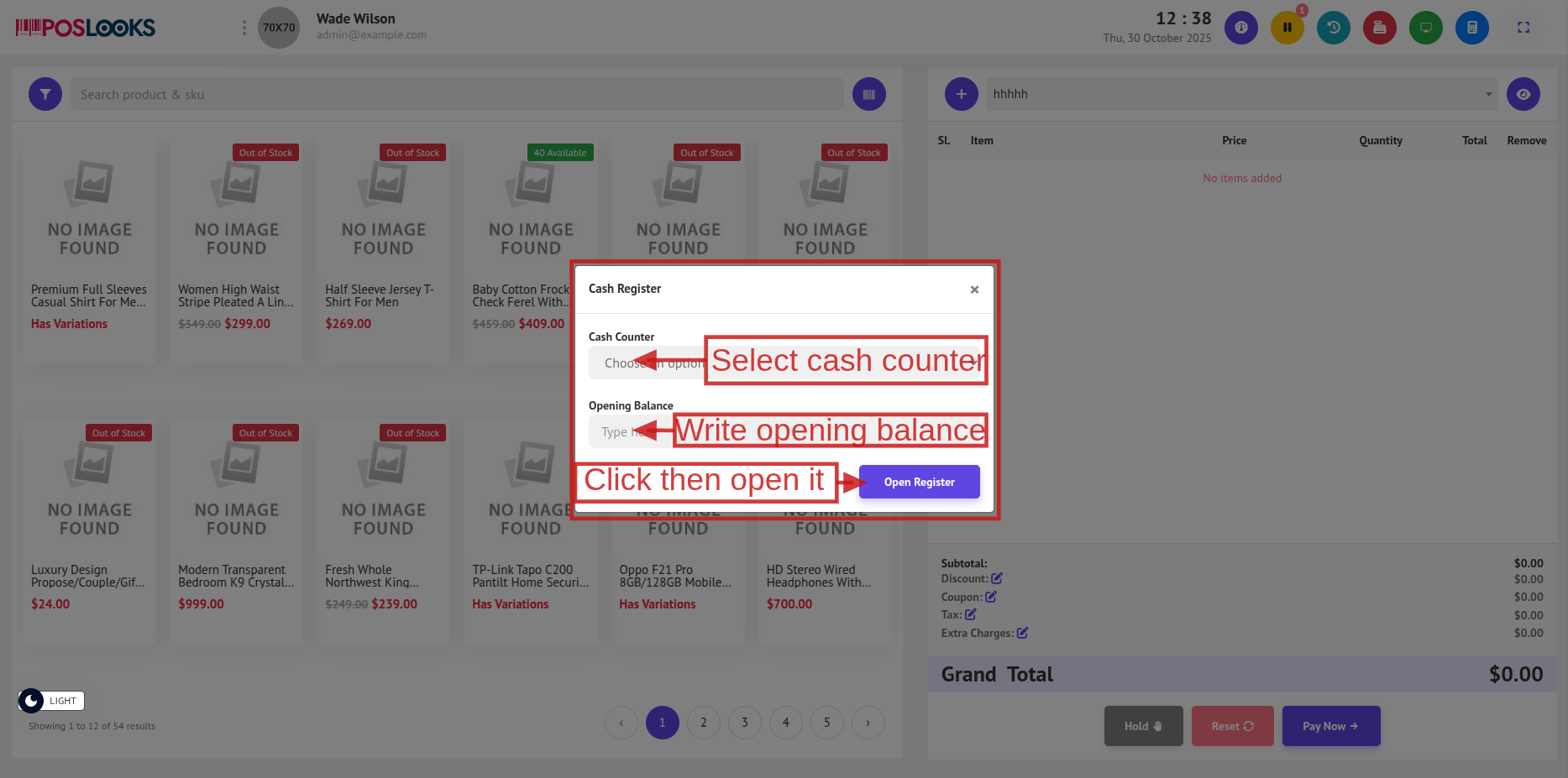 Once the cash counter is selected and the opening balance is provided, click the Open Register button.