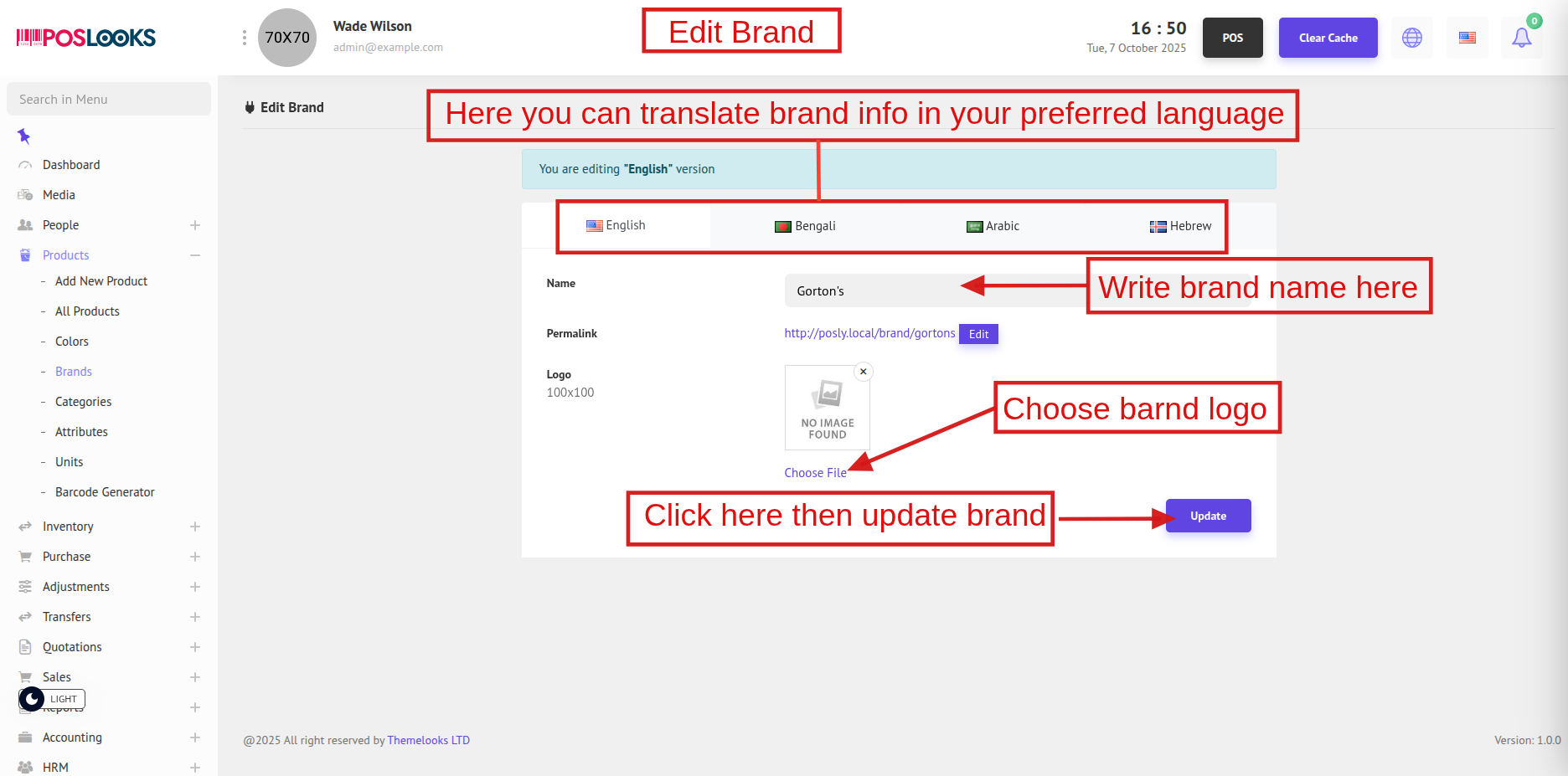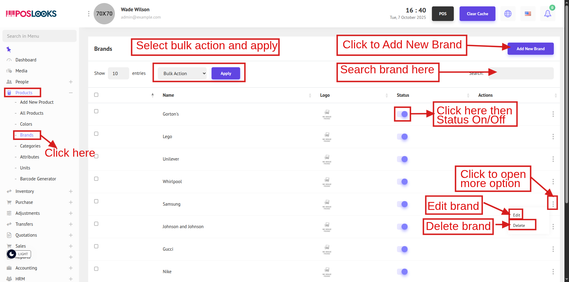 You can view the list of brands and various options on this page. To add a new brand, click the Add New Brand button at the top. You will be redirected to a new page to enter brand details.