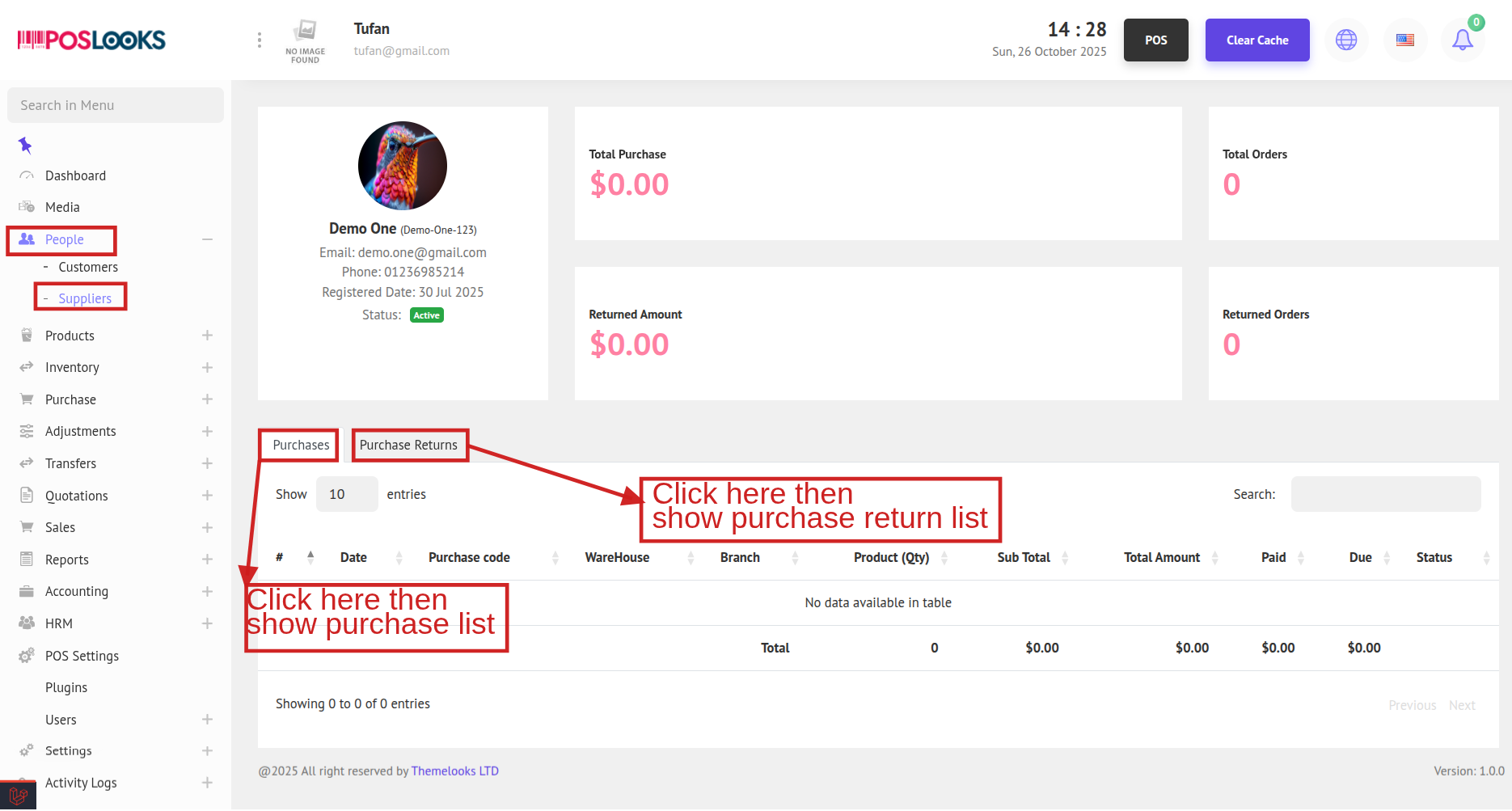 To view supplier details, click the Details button. You will be redirected to the Supplier Details page, where you can see the total number of orders, total purchase amount, and total returns made by the supplier.