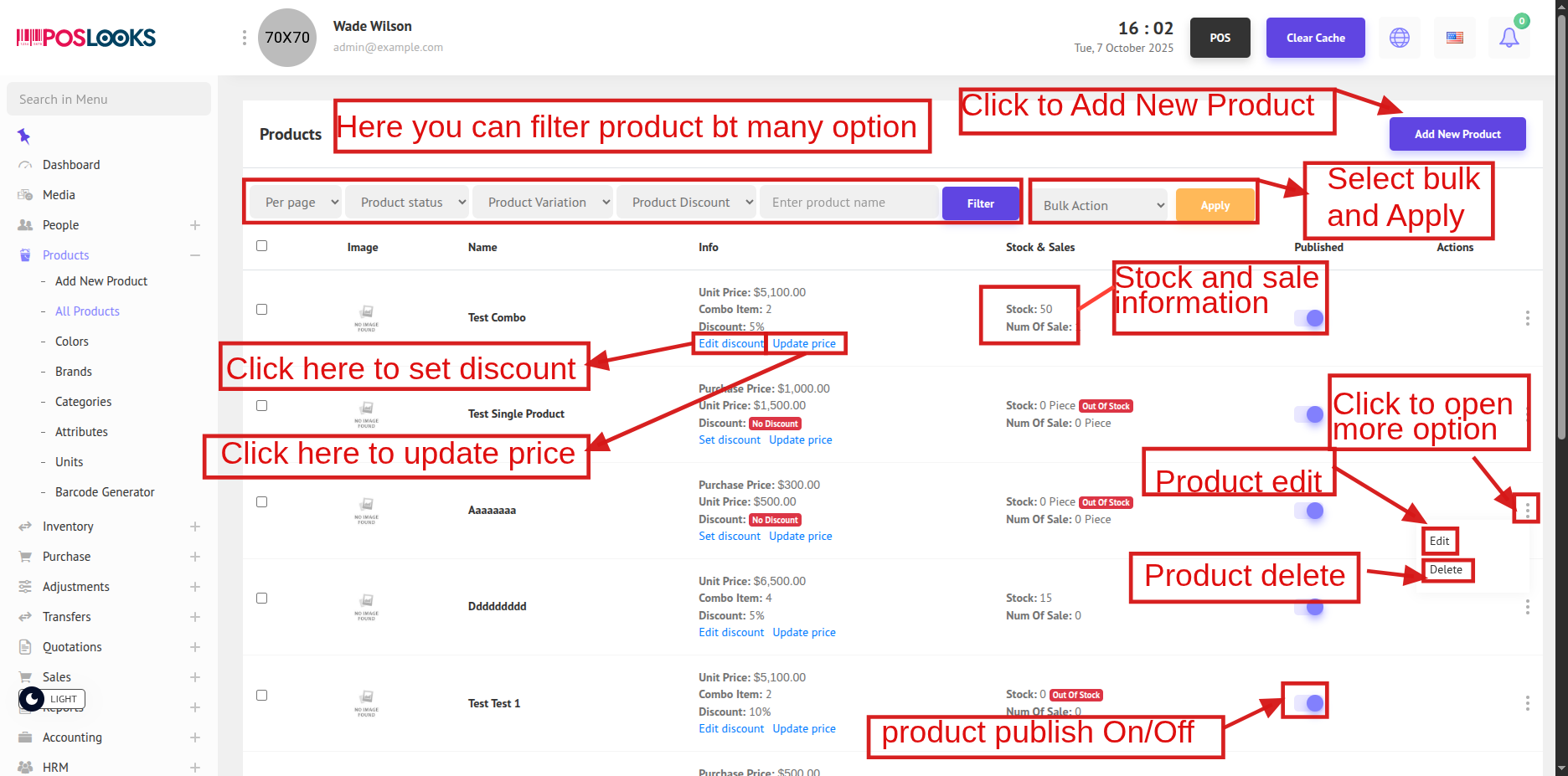 To view the product list, go to Products > All Products. You will be redirected to the Product List page. The image below provides a brief explanation of the features and options available on this page.