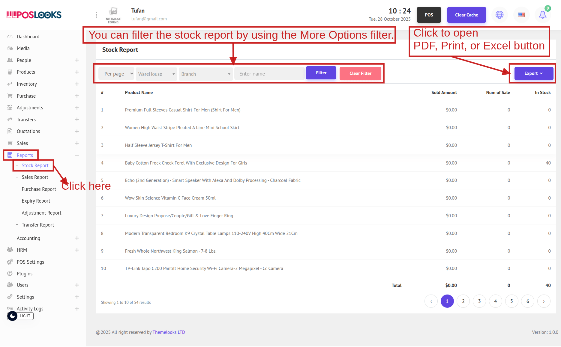 Click the Export button to open a drop-down with Print, PDF, and Excel options. Select any of these to download the stock report in your preferred format.