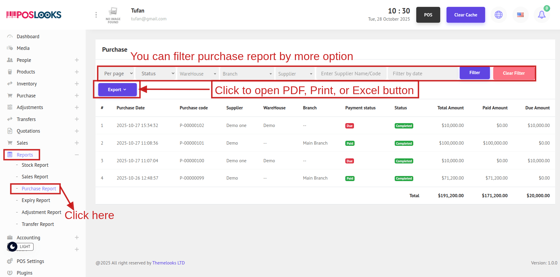 3. Navigate to Reports -> Purchase Report to view all purchase data. Use Export to choose Print, PDF, or Excel and download the report.
