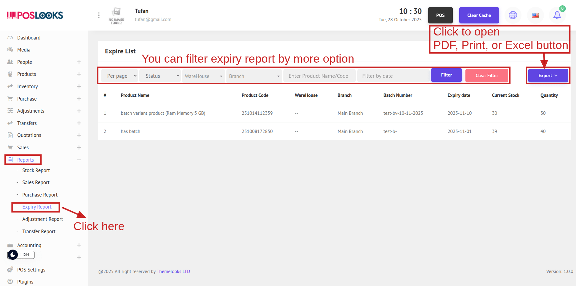 4. Navigate to Reports -> Expiry Report from the menu bar. You’ll be redirected to the Expiry Report page, where all expiry data is displayed. Click the Export button to open a drop-down with Print, PDF, and Excel options, then select your preferred format to download the report.