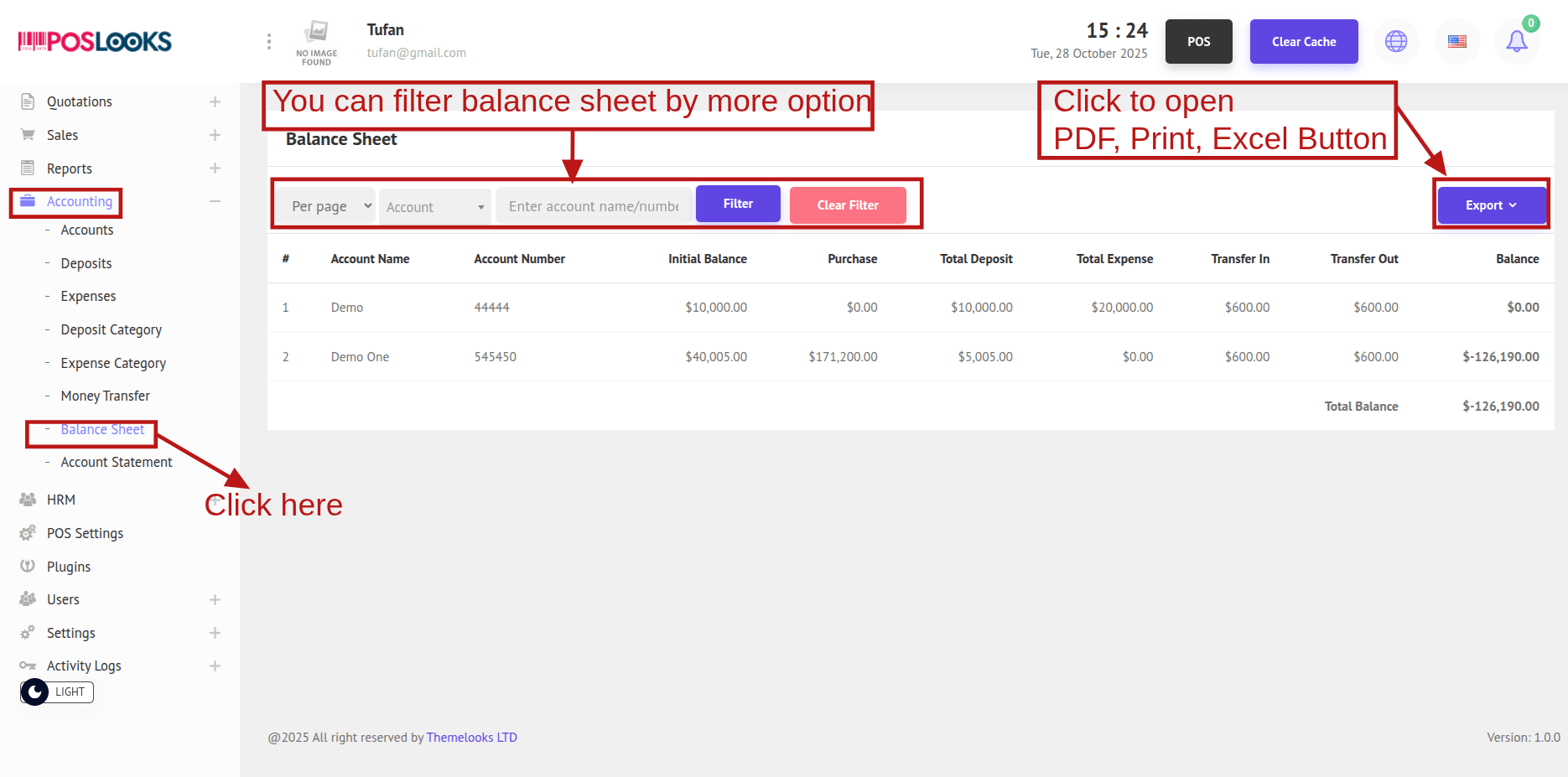 To view the Balance Sheet, go to Accounting -> Balance Sheet. You’ll be redirected to the Balance Sheet page, where the data is displayed.