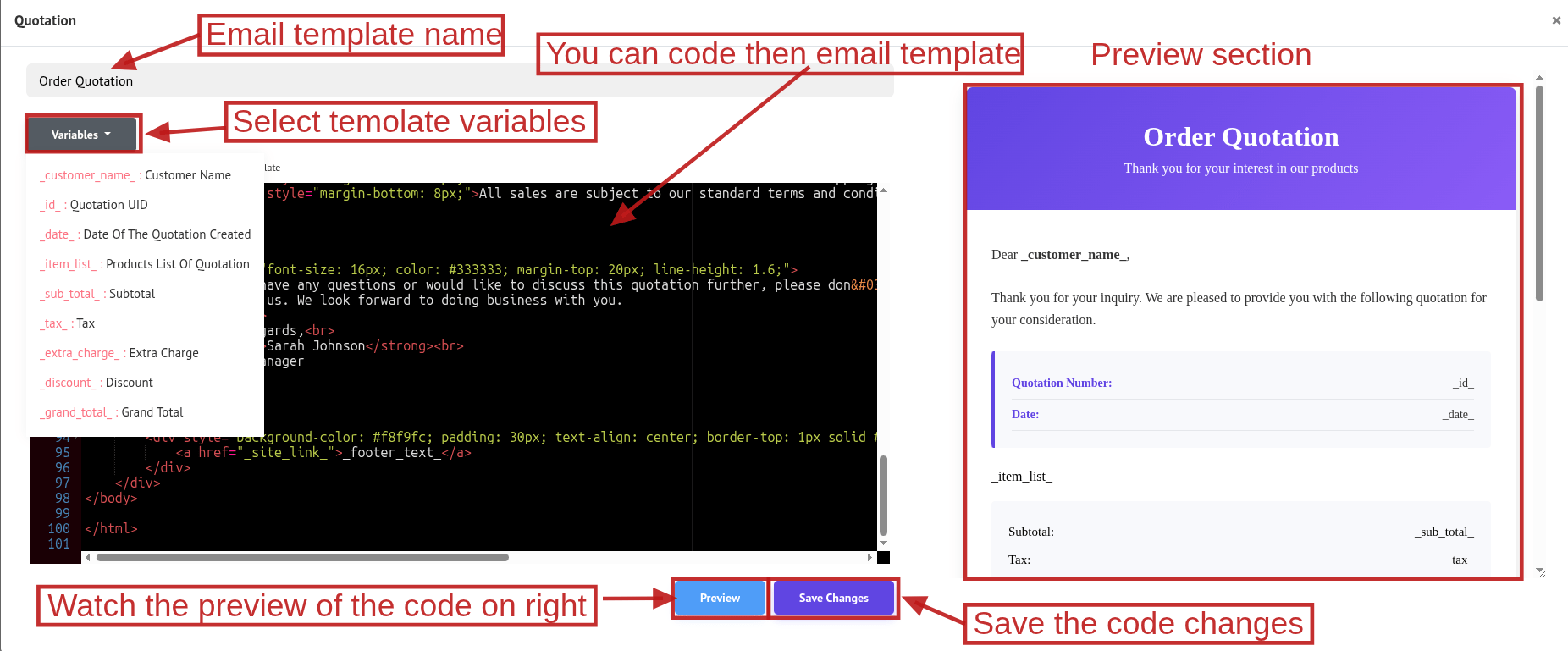 As you can see in the below image, the modal is divided into two sections. The left side is a Code Editor, where the template code is written. And the right side is a Preview box where you can see the preview for that code. Make changes to the code and click Preview to view the update.