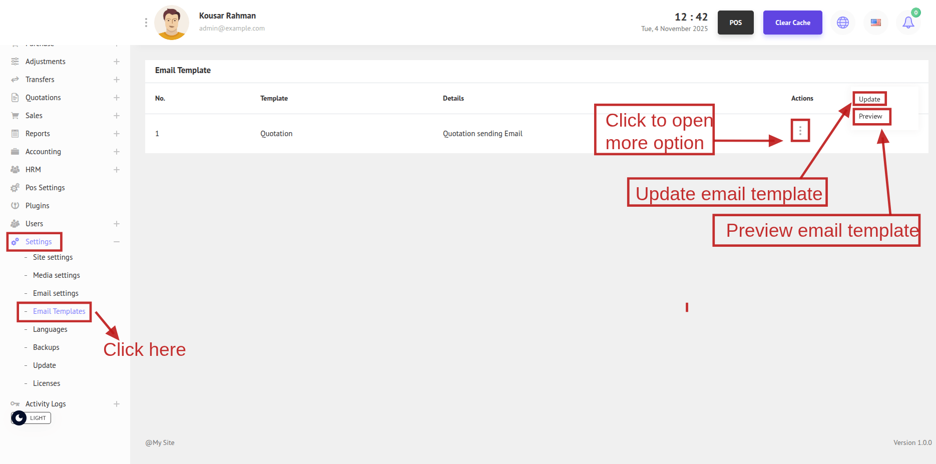 Now to update an email template click the three dots(.)and then click Update. A Modal will appear.