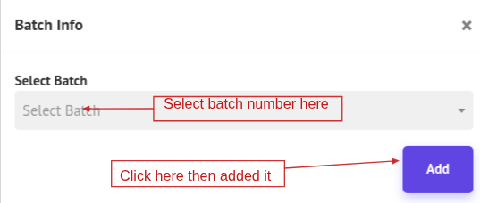 If the product has a Batch, a popup modal will open. Select the batch and click Add. To edit it, click the Edit icon — the batch modal will open again. Change the selection and click Add to update it.