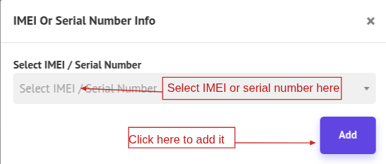 If the product has an IMEI, an IMEI modal will open. Select the IMEI and click Add. To edit it, click the Edit icon — the IMEI modal will open again. Change the IMEI and click Add to save the update.
