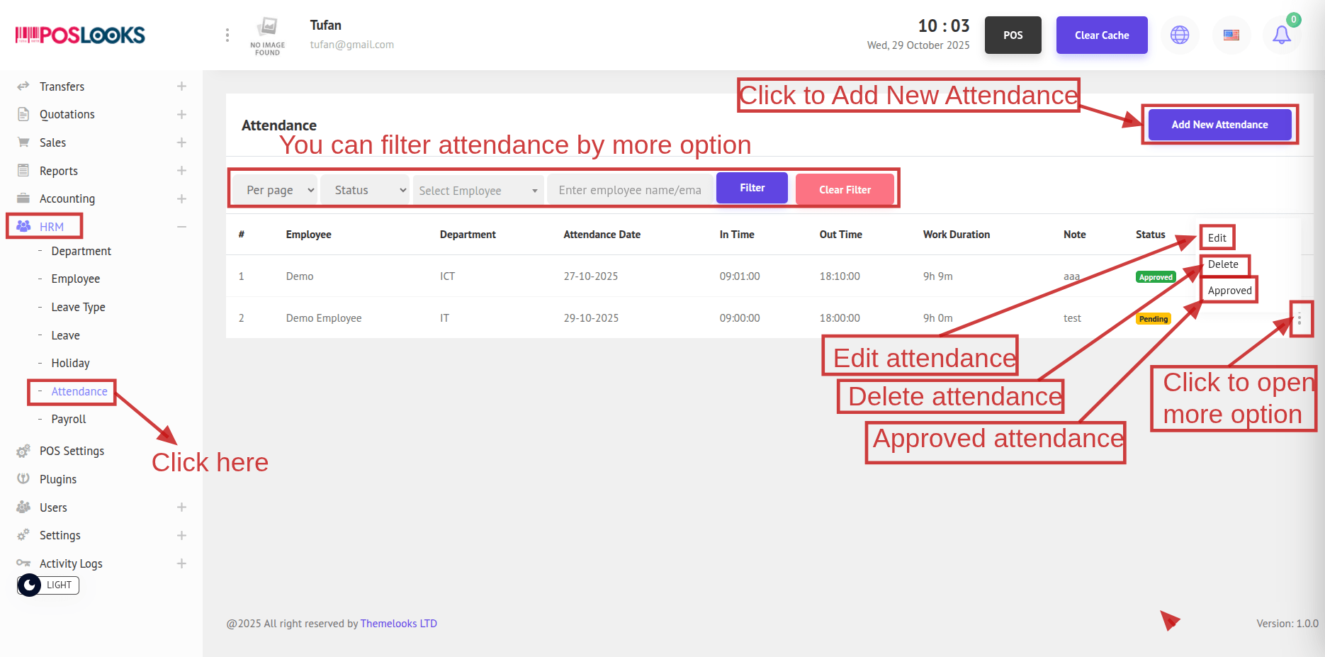 From the menu bar, select HRM -> Attendance. This opens the Attendance page showing all attendance records.