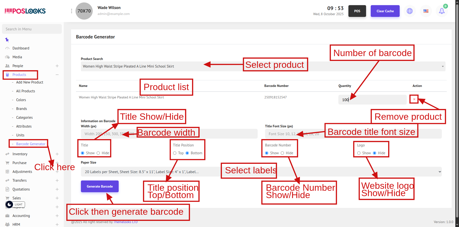 To view the Barcode Generator, navigate to Products > Barcode Generator. Here, you will see the Bar-code Generator page where you can generate bar-codes for your products.