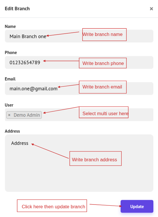 To edit branch information, click the Edit button. A popup modal will appear where you can update the branch details. After making the changes, click Update. You can also delete a branch by clicking Delete.