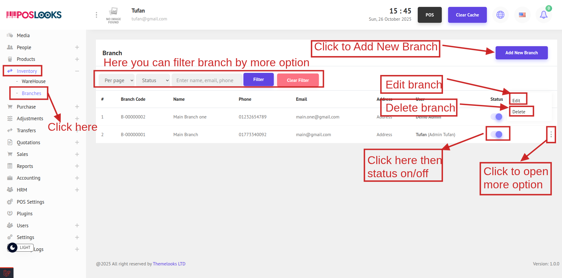To see the Branch List, go to Inventory -> Branches from the menu bar. You will be able to view all branches on the Branch List page.