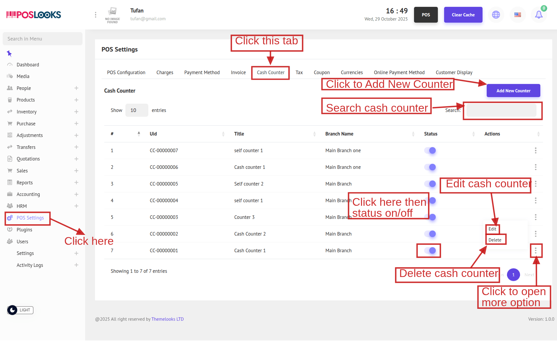 Navigate to POS Settings, When the POS Settings page loads, click the Cash Counter tab from the tab bar. The system will open the Cash Counter page, showing all cash counter entries.
