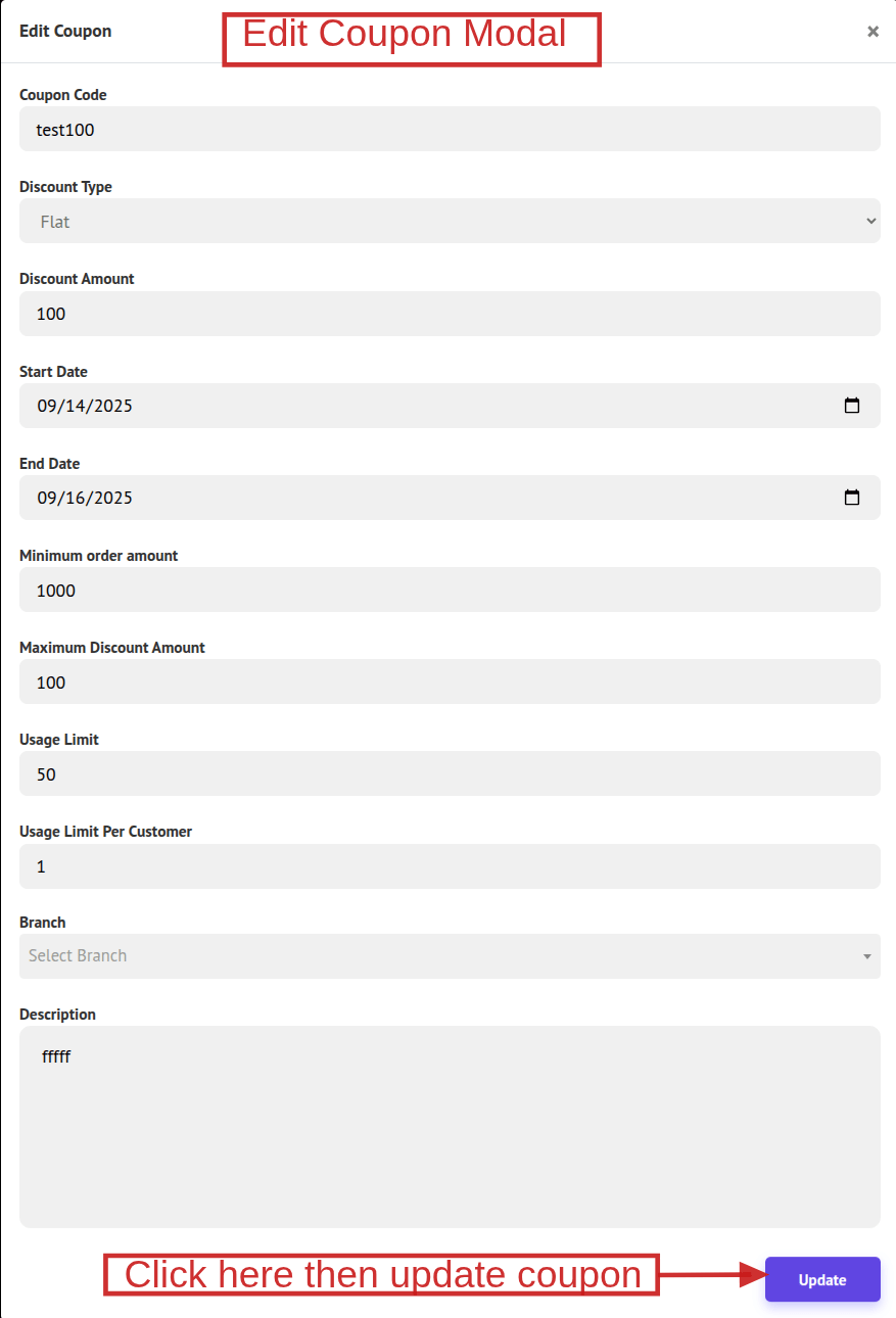 To update a coupon, click Edit, make the necessary changes in the popup, and click Update to save.