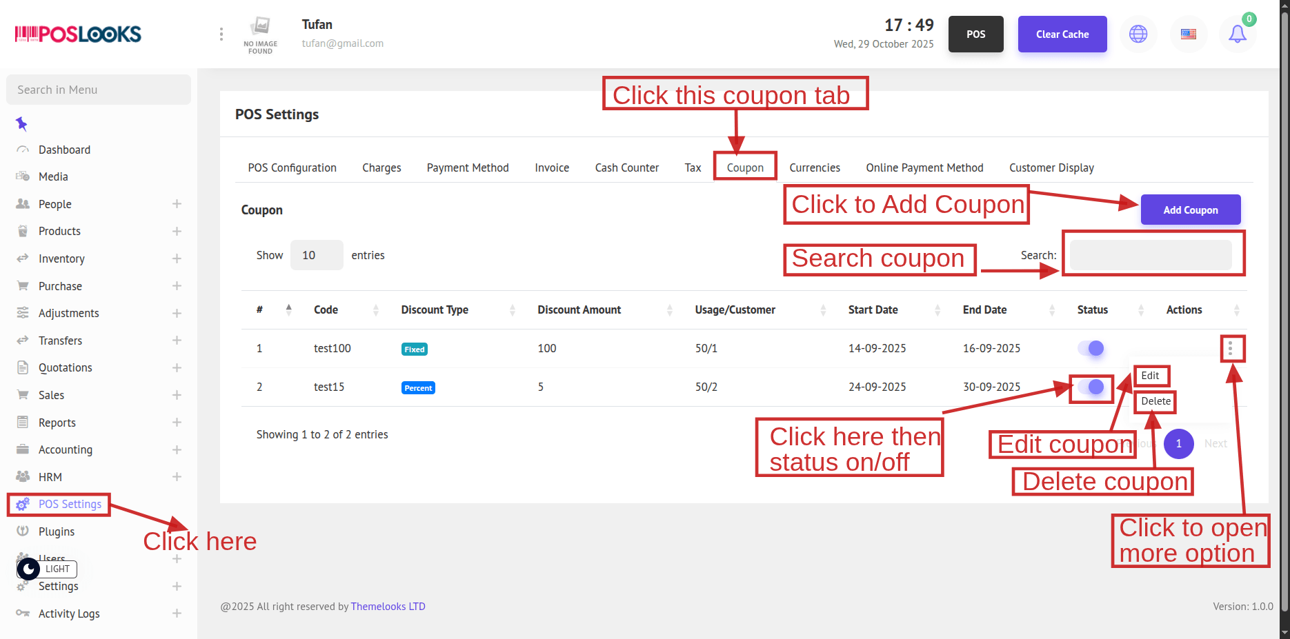 Navigate to POS Settings, When the POS Settings page loads, click the Coupon tab from the tab bar. The system will open the Coupon page, showing all coupon entries.