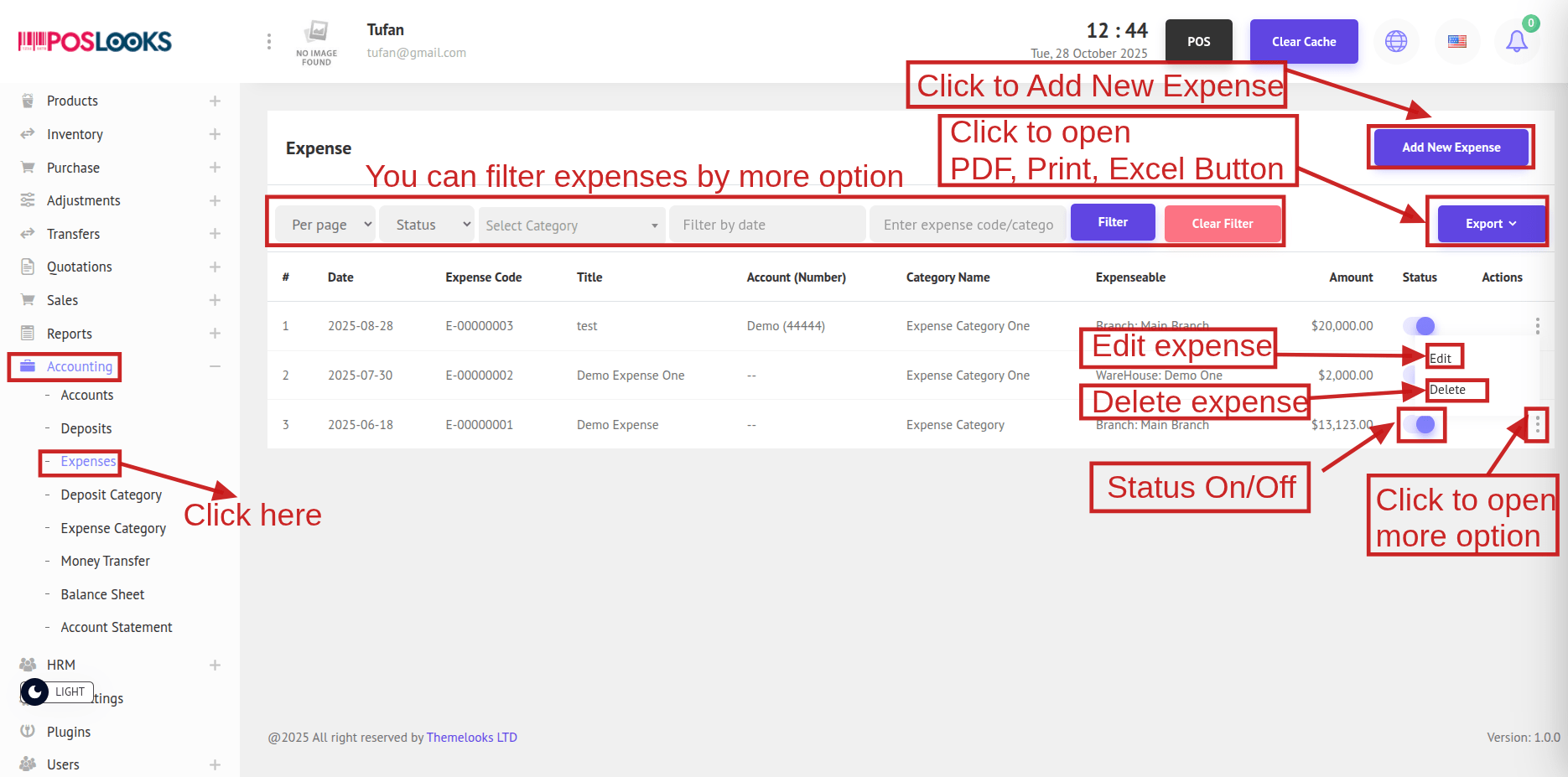 To see the Expenses, go to Accounting -> Expenses from the menu bar. You will be redirected to the Expenses page, where all expense records are displayed. Click Export to download the data in PDF, Excel, or Print format.