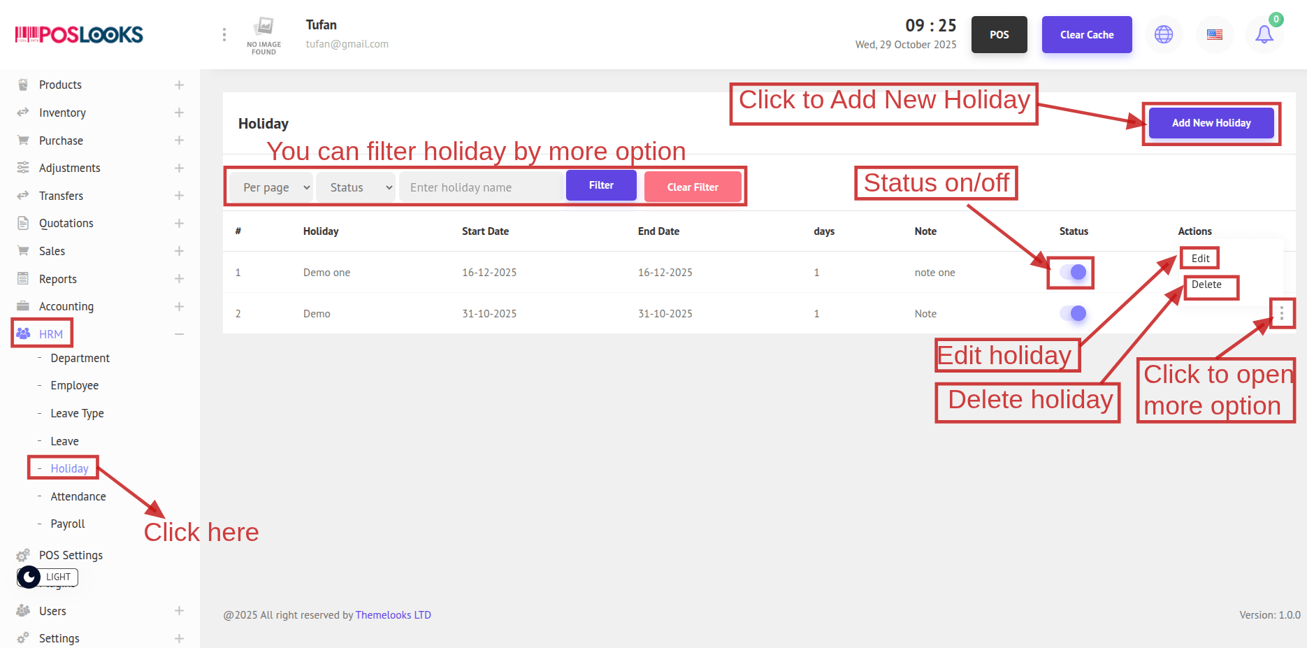 To view the holiday list, go to HRM -> Holiday in the menu bar. You’ll be redirected to the Holiday page, which displays all holidays.