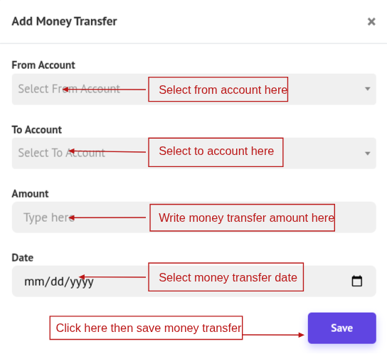 Before creating a money transfer, set up an Account. Then click Add Money Transfer, complete the popup form, and click Save to create the transfer.