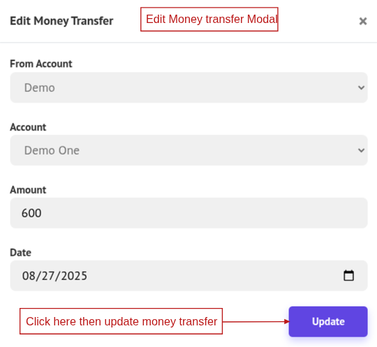 To edit a money transfer, click Edit to open the edit popup, make your changes, and click Update to save it. Also you can remove a money transfer, click Delete.