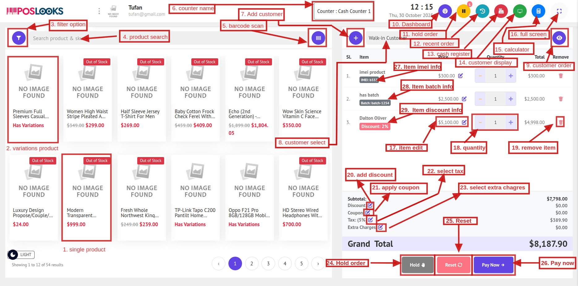 24. Hold Order: Click Hold to save all current cart items as a held order that you can retrieve and resume later.