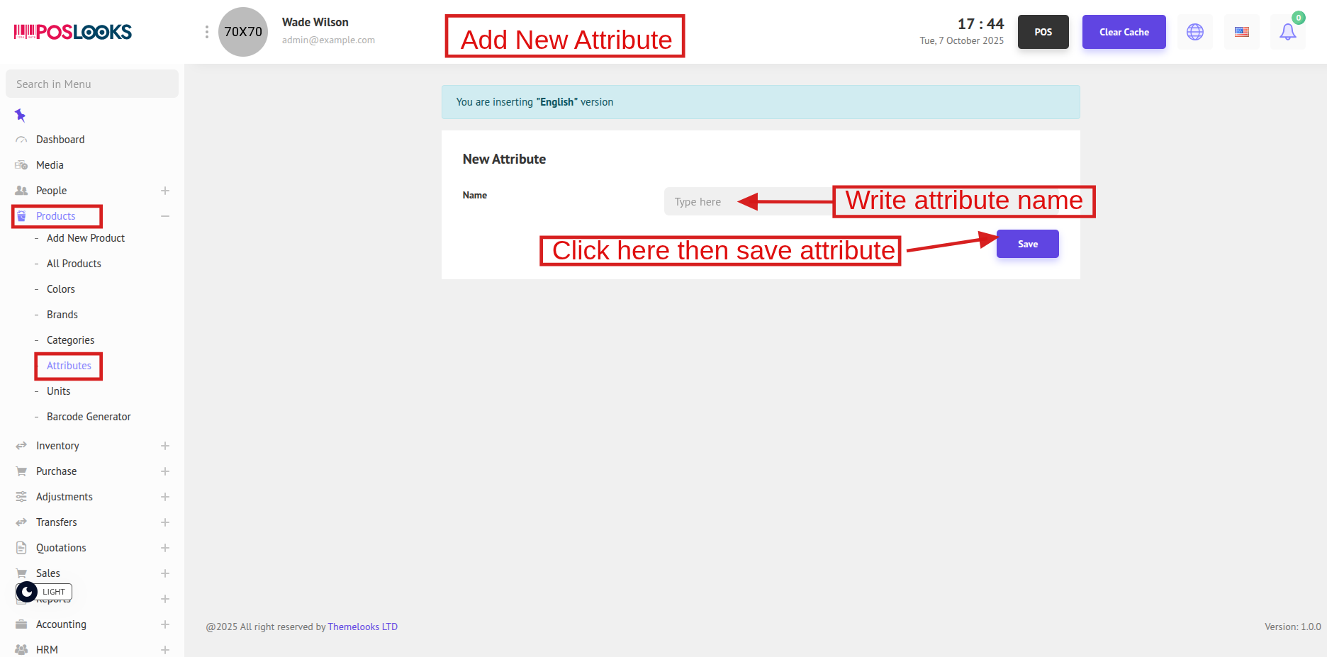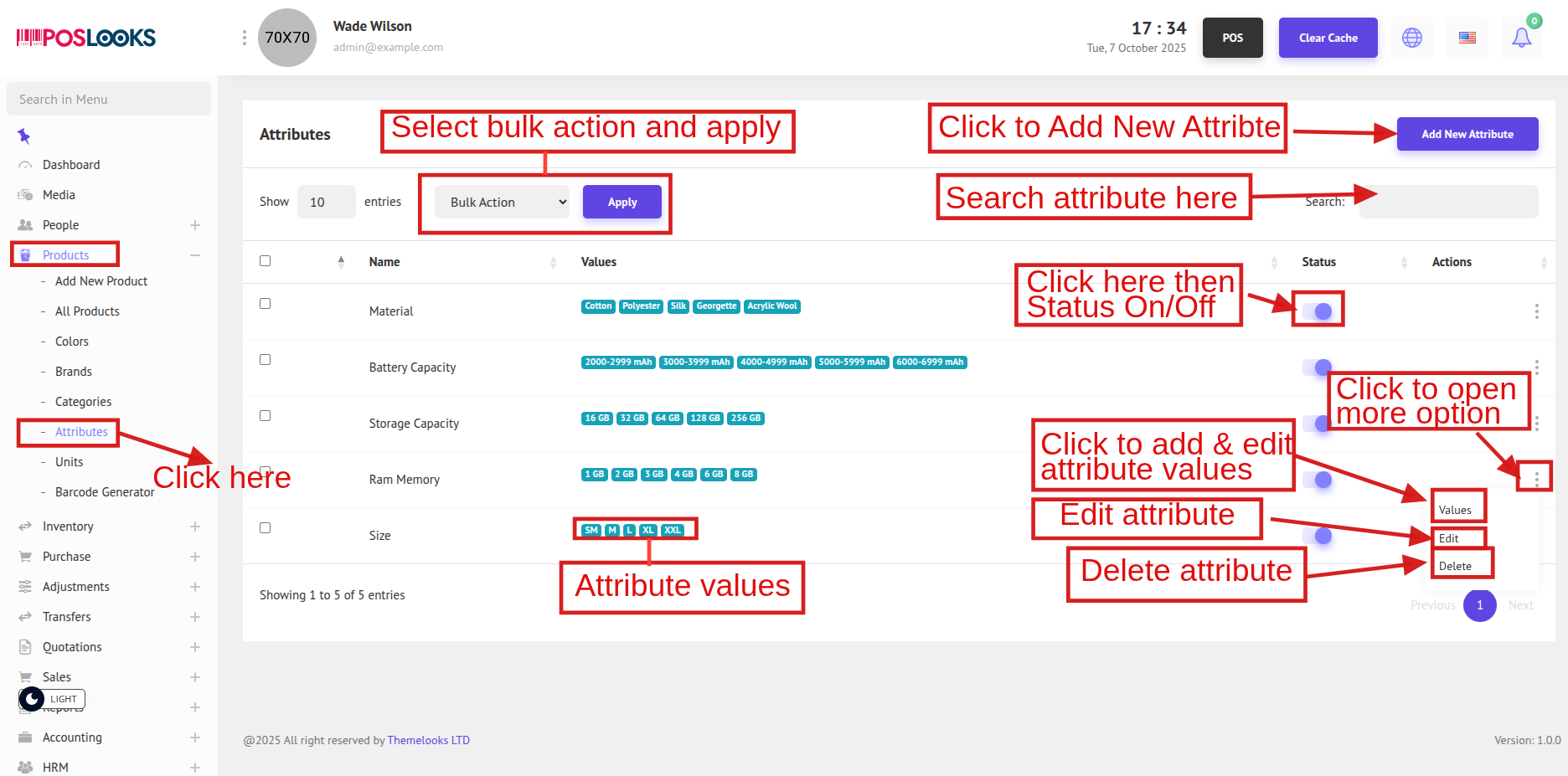To view the Product Attributes list, go to Products > Attributes. This will display all available product attributes in the system.