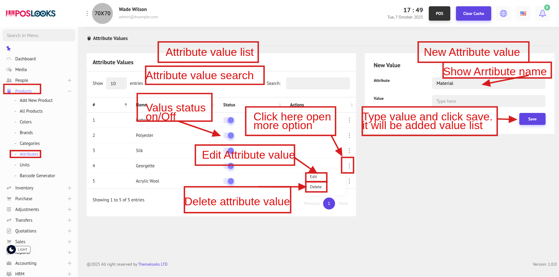 To add attribute values, click Values from the Attribute List. You will be redirected to the Value List of that attribute.