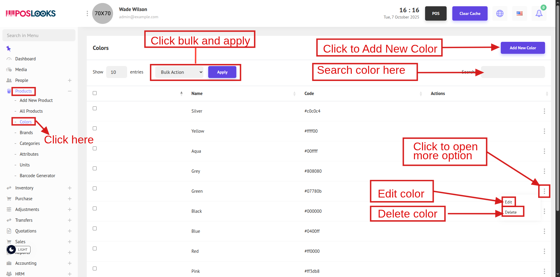To view the list of Product Colors, navigate to Products -> Colors as shown below.