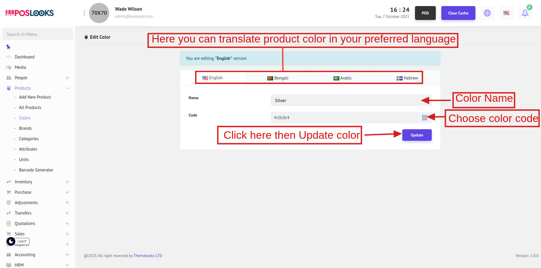 To update a color, click Edit from the Color List page. You will be redirected to the Edit Color page to modify the color details.