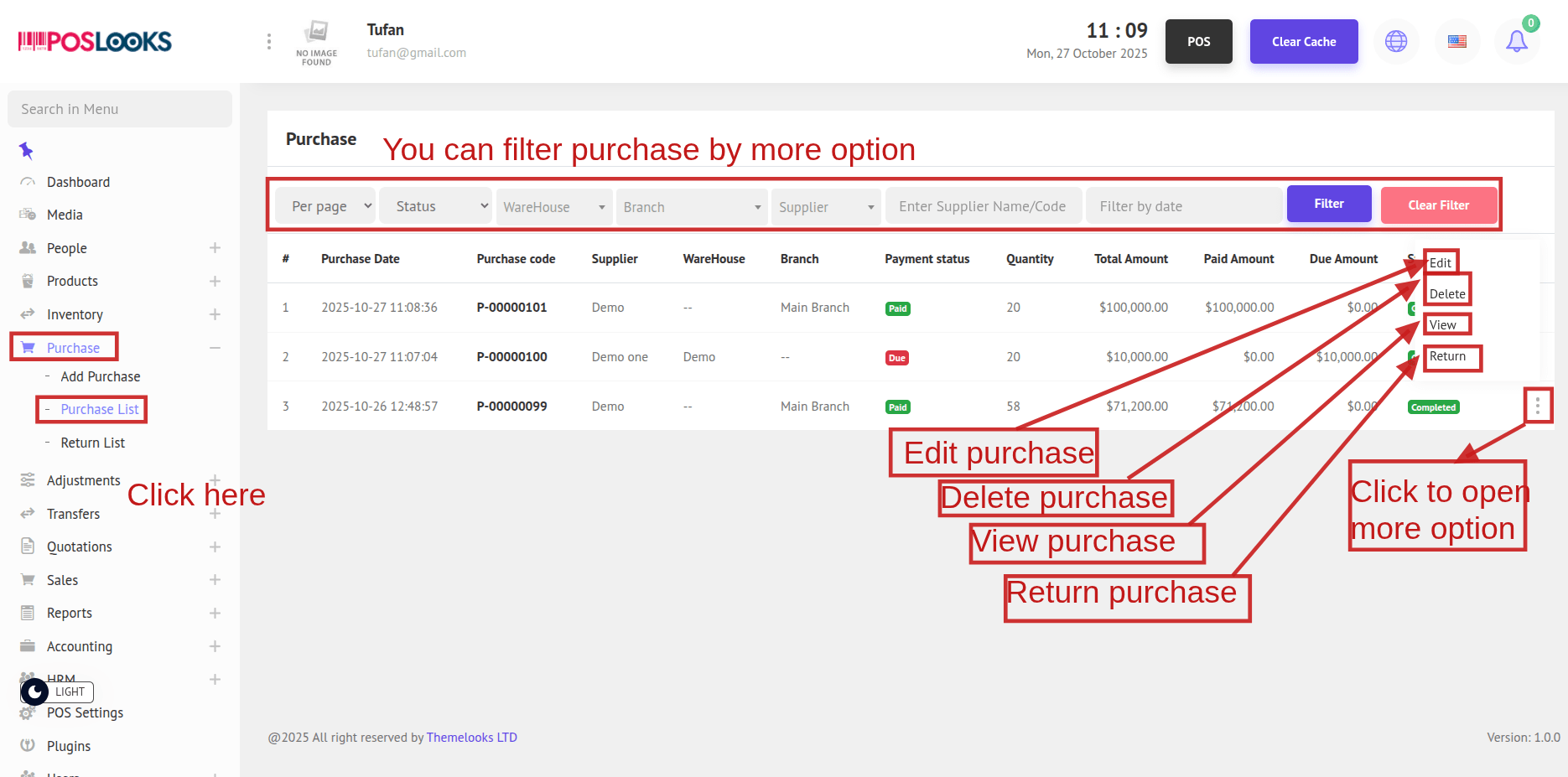2. To see the Purchase List, go to Purchase -> Purchase List from the menu bar. You will be able to view all purchases on the Purchase List page.