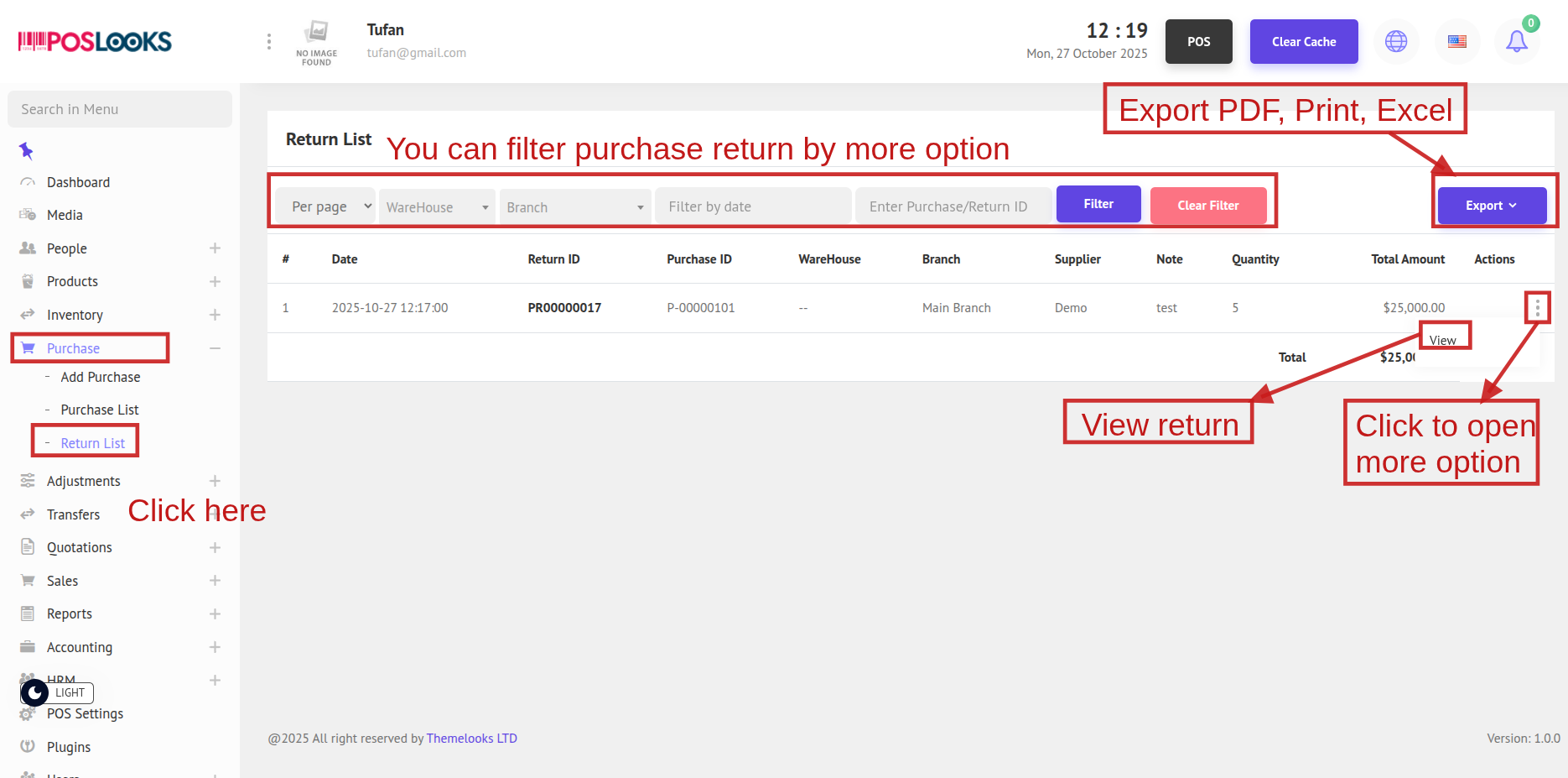 3. To see the Purchase Return List, go to Purchase -> Return List from the menu bar. You will be able to view all returns on the Return List page. You can also export the data by clicking Export, which allows you to download the file in PDF, Print, or Excel format.
