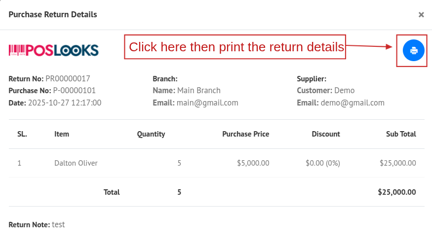 Click the View button to see the return details in a popup modal.
