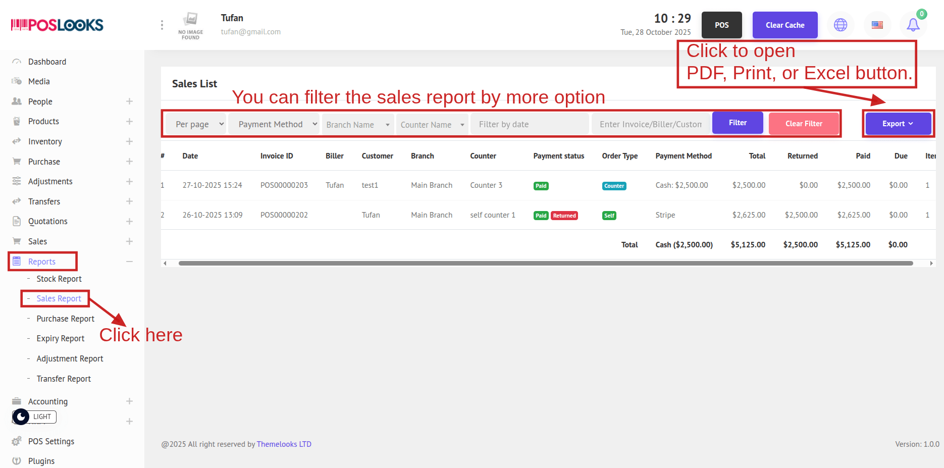 2. To view the Sales Report, go to Reports -> Sales Report from the menu bar. You’ll be redirected to the Sales Report page, where all sales data is displayed. Click the Export button to open a drop-down with Print, PDF, and Excel options, and select your preferred format to download the report.