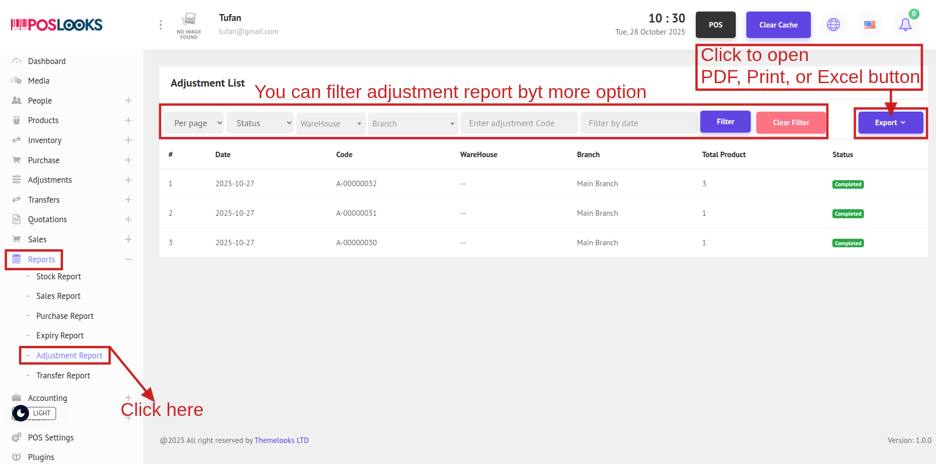 5. To view the Adjustment Report, go to Reports > Adjustment Report from the menu bar. You’ll be redirected to the Adjustment Report page, where all adjustment data is displayed. Click the Export button to open a drop-down with Print, PDF, and Excel options, then select your preferred format to download the report.